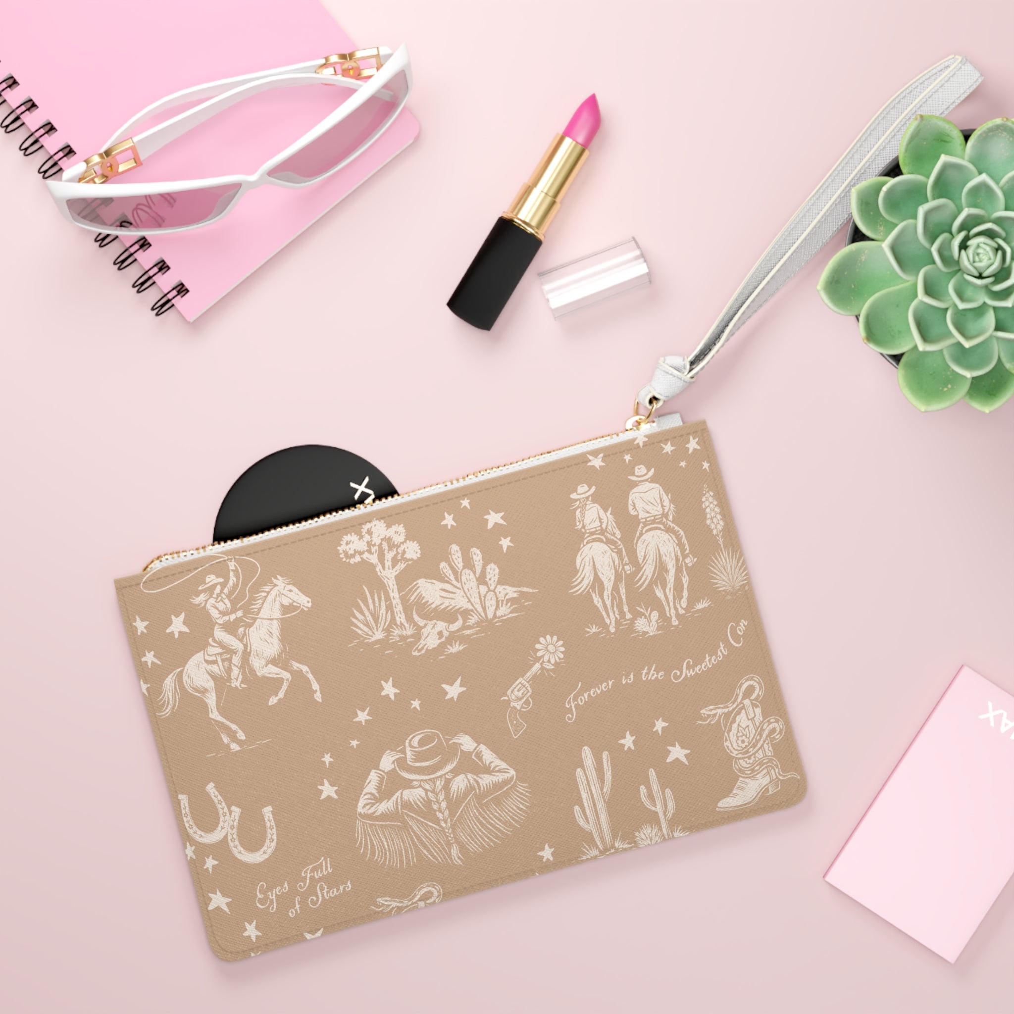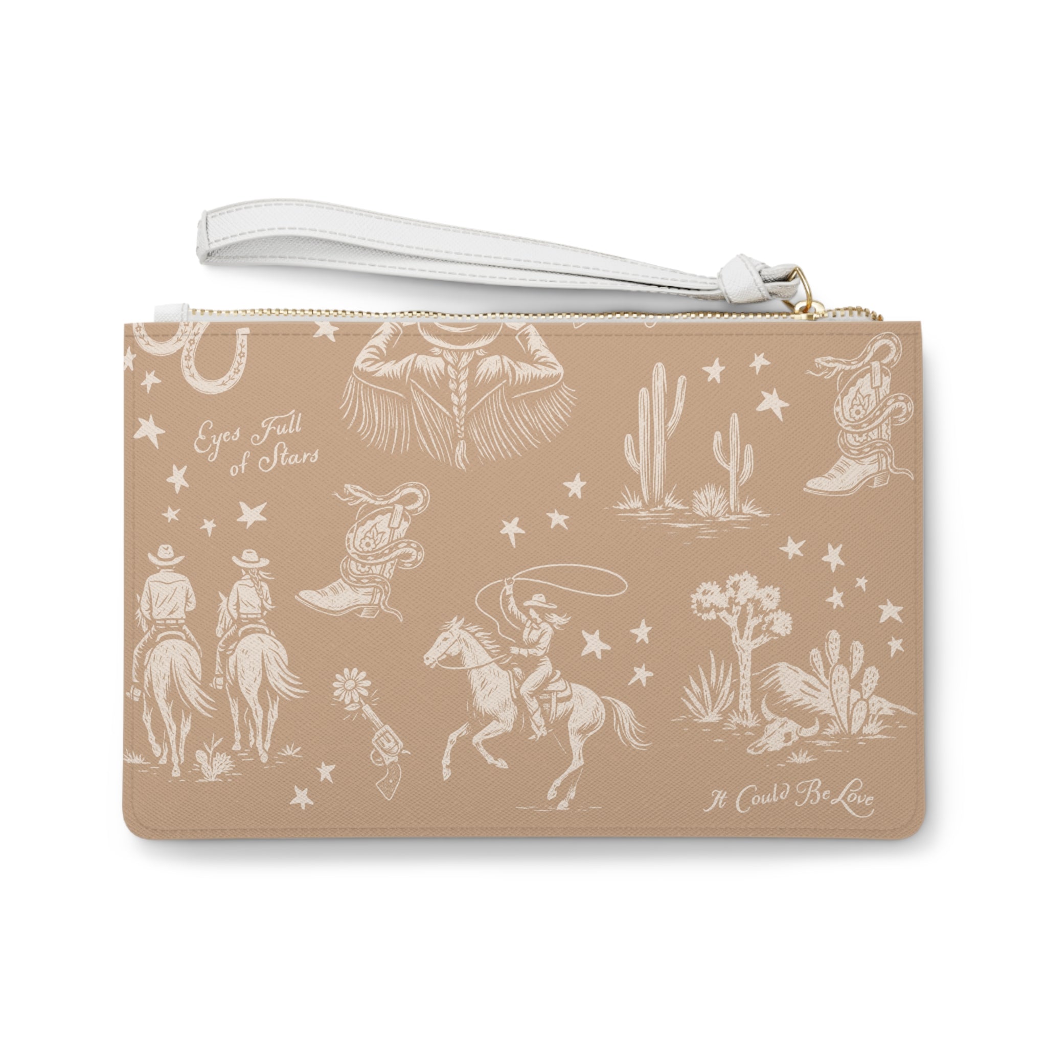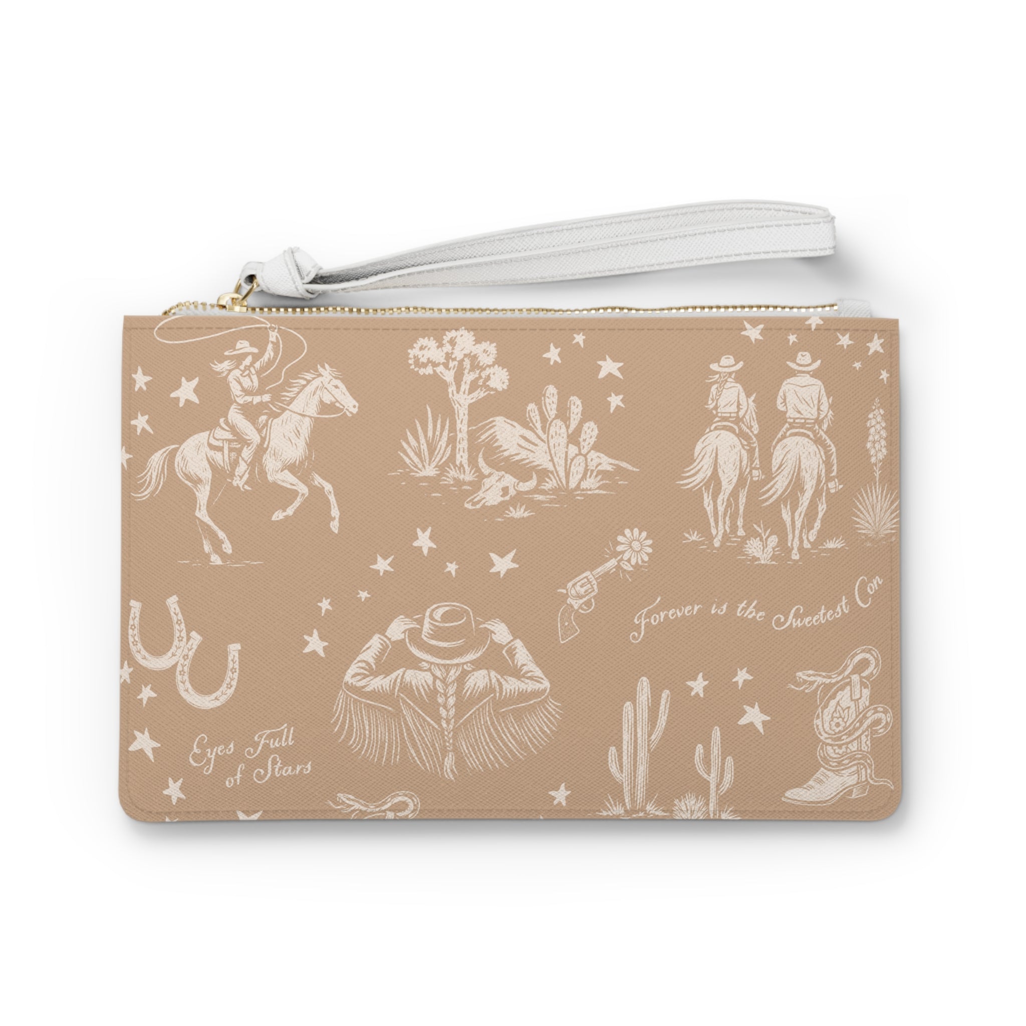 A little western magic for your everyday wanderings. This wristlet is crafted from soft vegan leather and printed with our cowboy toile in a warm honey shade that feels like late afternoon sun. The loop strap slips on easily when your hands are full of life, snacks, or both. Inside you will find a lined pocket for the tiny things that always try to escape.